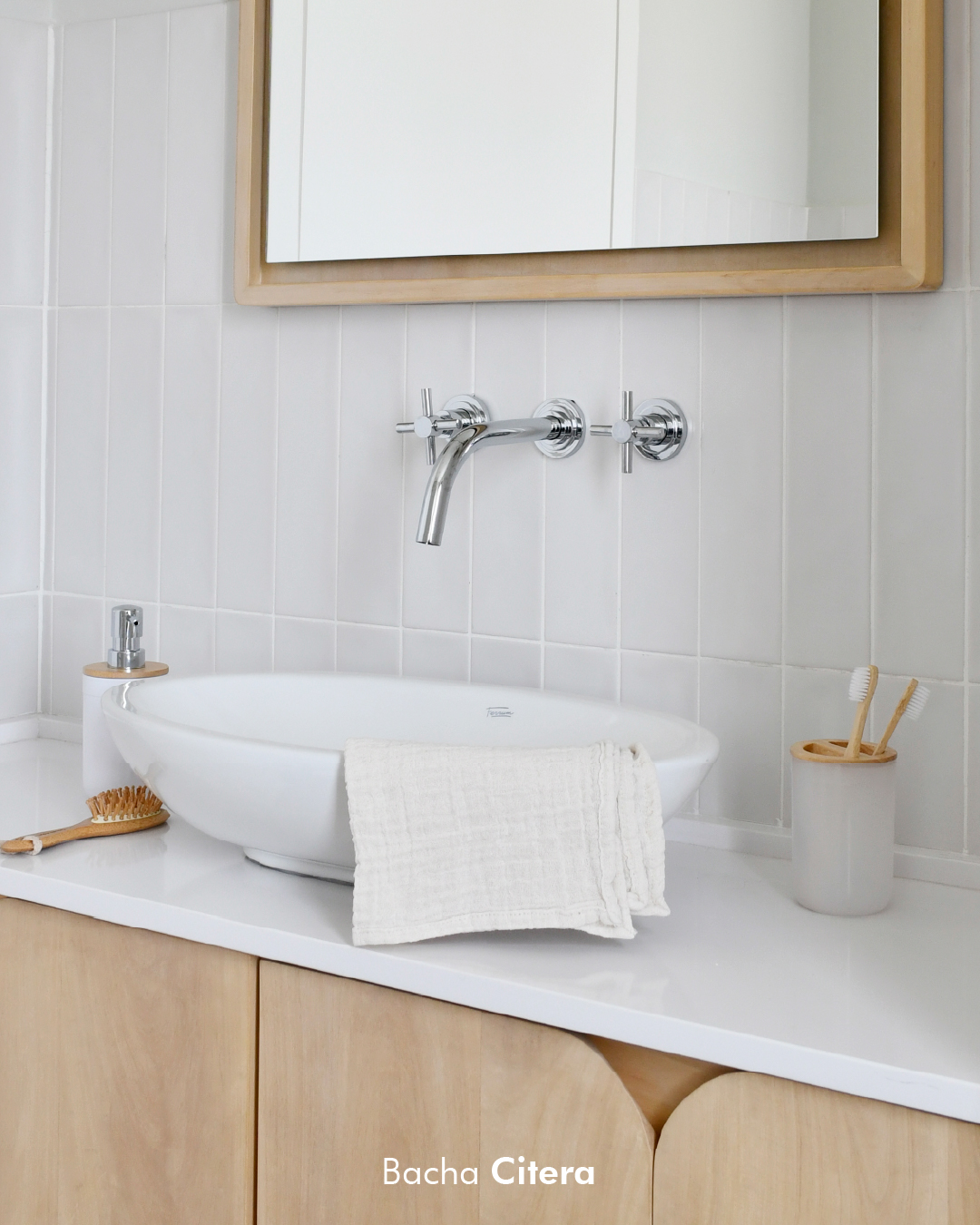 La bacha blanca de Ferrum, de líneas puras y suaves, se integra naturalmente sobre la mesada. El espejo con marco de madera y la iluminación cálida completan un conjunto sereno, contemporáneo y funcional. Una de las grandes apuestas para 2026.