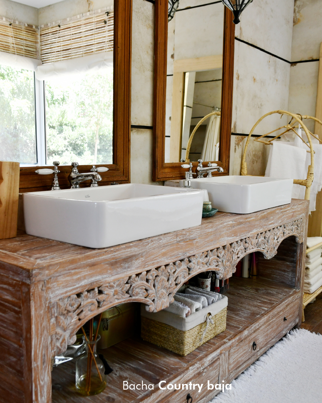 - Madera natural y bacha en color suave: equilibrio y calma