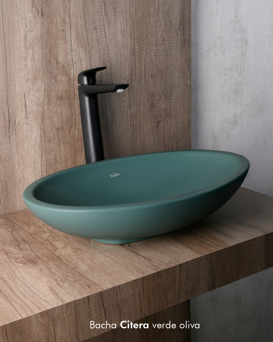 La bacha negra de Ferrum, con su terminación brillante, se presenta como una pieza escultórica que contrasta con la textura orgánica de la madera. La grifería de líneas rectas y el espejo circular completan un diseño curado, donde cada elemento destaca sin competir.